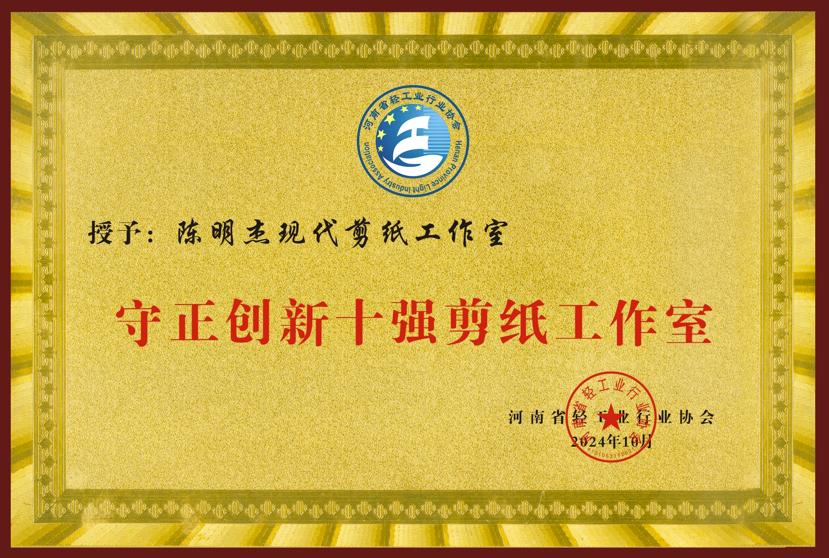近日,“河南省第十二届学术与产业发展年会”在三门峡市召开,会议表彰了一批有代表性的工作室,304永利集团登录入口“陈明杰现代剪纸工作室”被授予“守正创新十强剪纸工作室”。